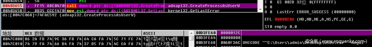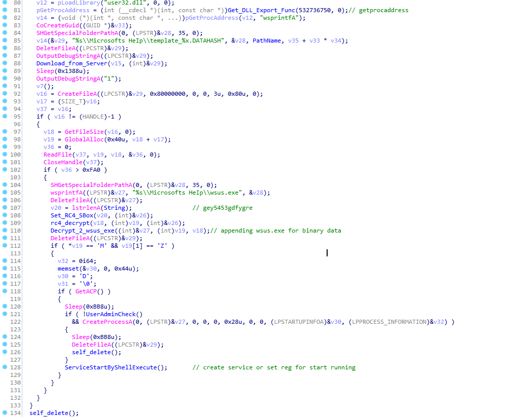 从上面的main函数来看,这个样本是一个downloader,主要行为是:从服务器下载文件,解密并释放到Mircosofts_HeLP目录下,命名为wsus.exe,并启动进程或创建服务以完成样本的落地。下面看动态调试: