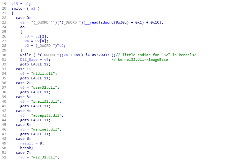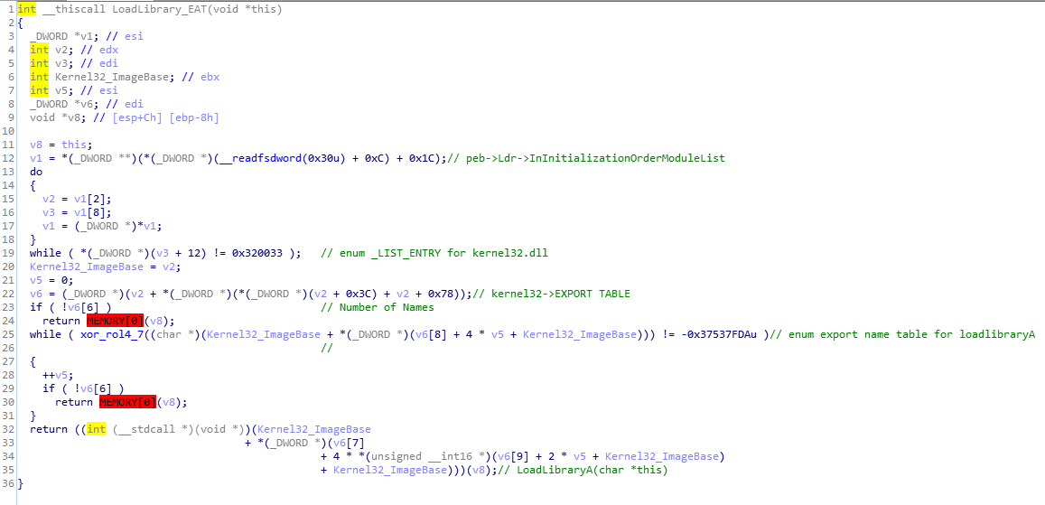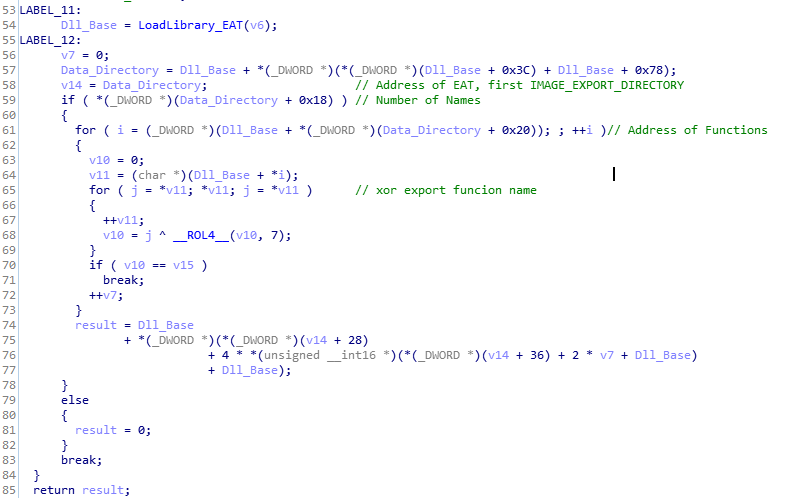 为方便阅读,代码已经加了注释,同样是采用遍历export name table,匹配加密的key的方式获取kernel32!LoadLibraryA()的地址,并用它获取待加载dll的基址。
