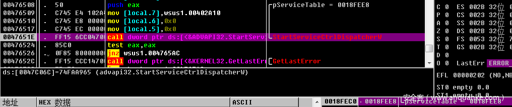 由于创建服务的启动类型为auto start,所以wsus.exe中一定有一个SCM去管理服务的启动过程。