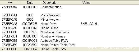分析结果表明,这个函数的行为类似于GetProcAddress(LoadLibrary(), char*pProc);函数定义是这样的:函数传进两个参数,第一个是函数名移位异或加密的值,另一个是选择函数所在dll在函数体switch结构中的case值。然后通过解析进程PEB,再调用LoadLibrary_EAT函数获取dll映象基址。然后按照PE文件在内存中的加载结构解析export table,将到处函数名移位异或加密并与第一个参数匹配。为方便阅读,特提取分析该样本的虚拟机的kernel32.dll的IMAGE_EXPORT_DIRECTORY结构体如下: