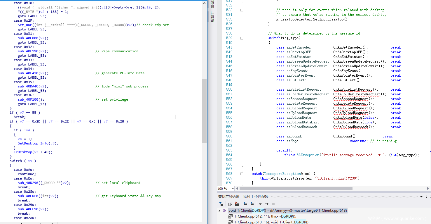 V3的代码,。鉴于二进制文件的静态分析中有很多麻烦的类和虚函数的标记工作,为了更彻底地分析样本,需要通过动态调试和部分源代码的参考,完成类和虚表的标记。