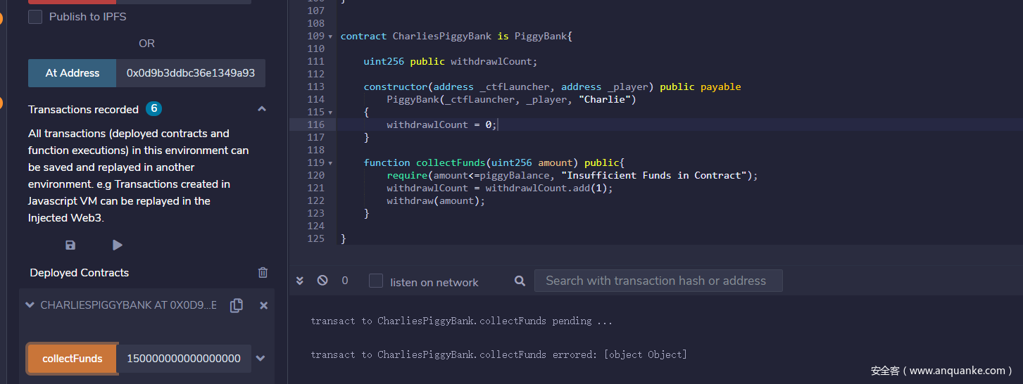 但是我们并不是。而我们可以发现 charliesPiggyBank 这个合约里面 以同样的命名定义了一个collectfunds