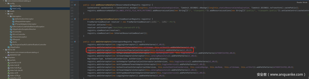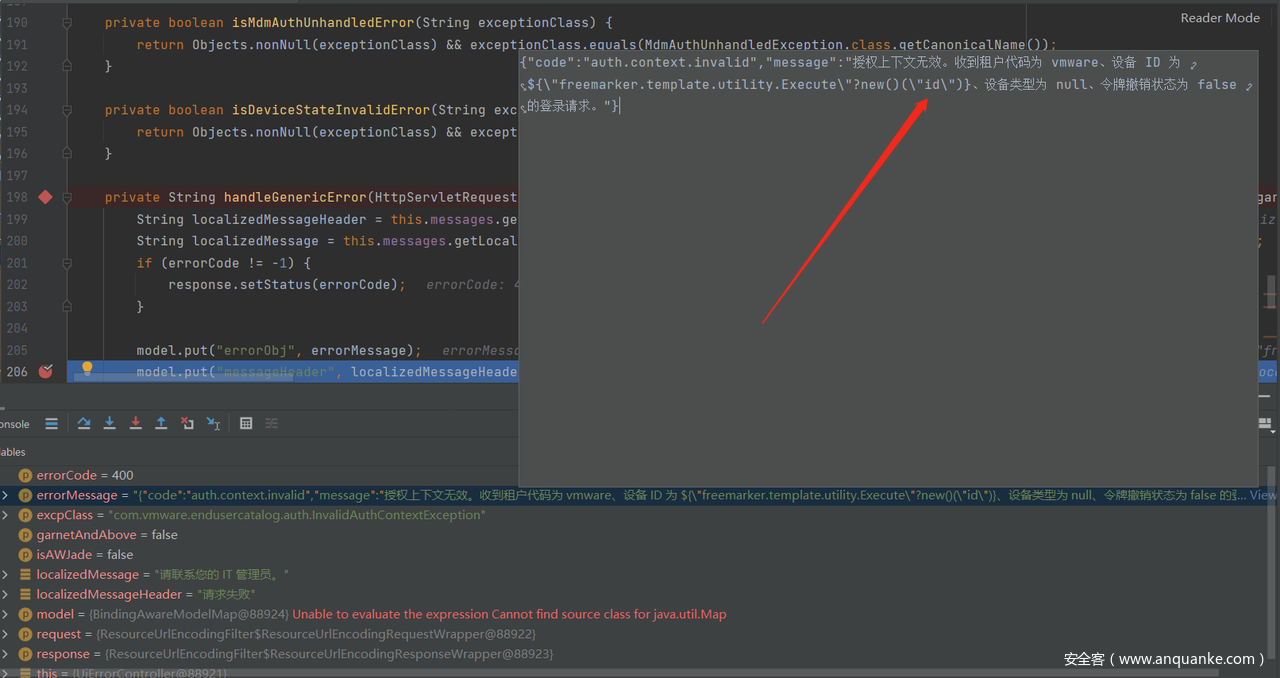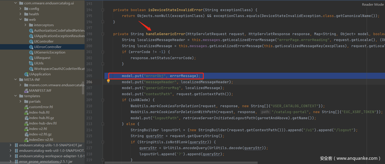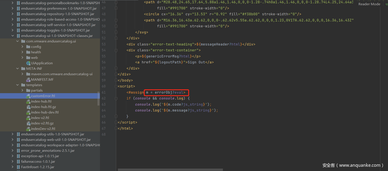 在Vmware中的endusercatalog-ui-1.0-SNAPSHOT-classes.jar自带的模板customError.ftl就调用了freemarker引擎的eval函数来渲染errObj,这就导致了本次SSTI注入漏洞。