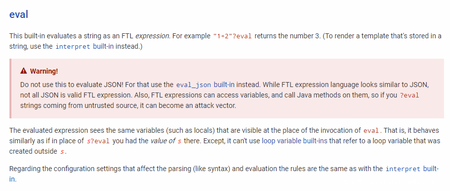 根据freemarker官网文档(https://freemarker.apache.org/docs/ref_builtins_expert.html#ref_builtin_eval)中给出了安全问题的提示。