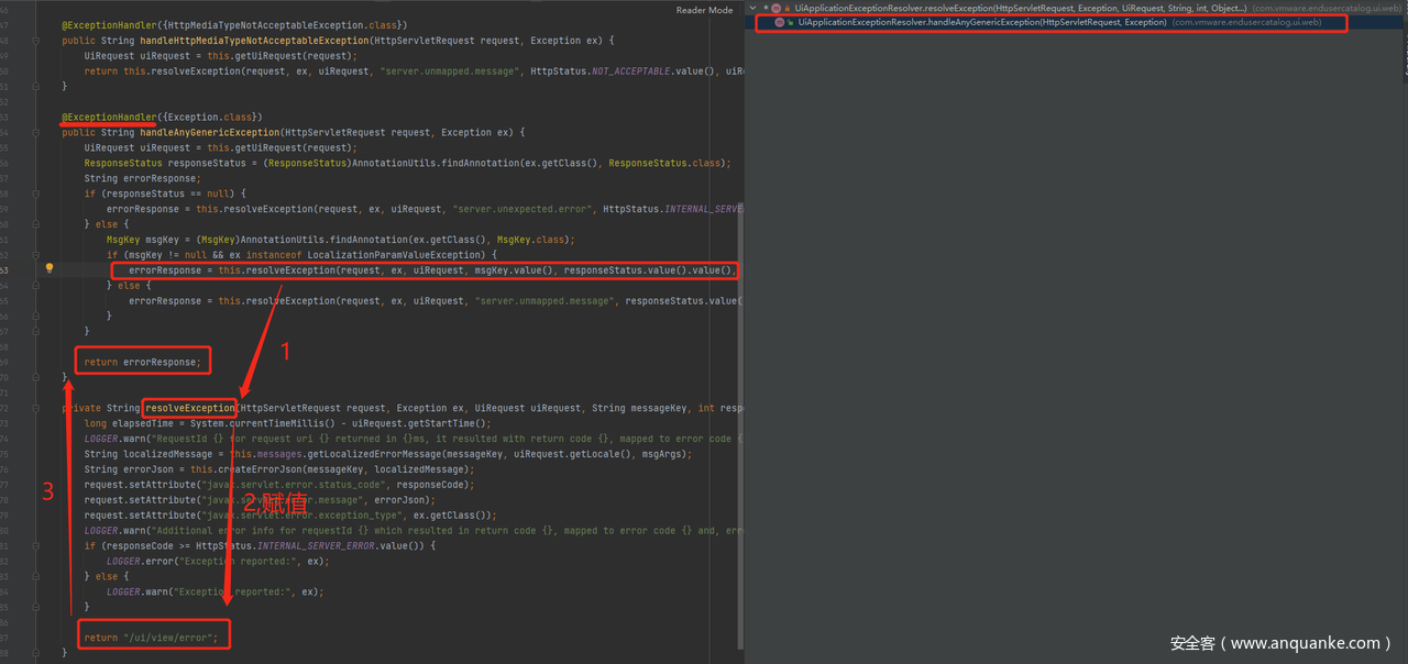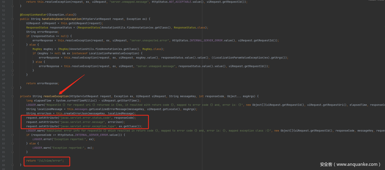 其中@ExceptionHandler表明,该处为异常处理器,当程序直接抛出Exception类型的异常时会进入handleAnyGenericException,再通过调用resolveException函数,进行赋值,最终都会返回/ui/view/error。