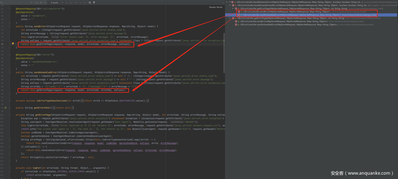 跟进其中出现的getErrorPage函数,位于com.vmware.endusercatalog.ui.web.UiErrorController#getErrorPage。