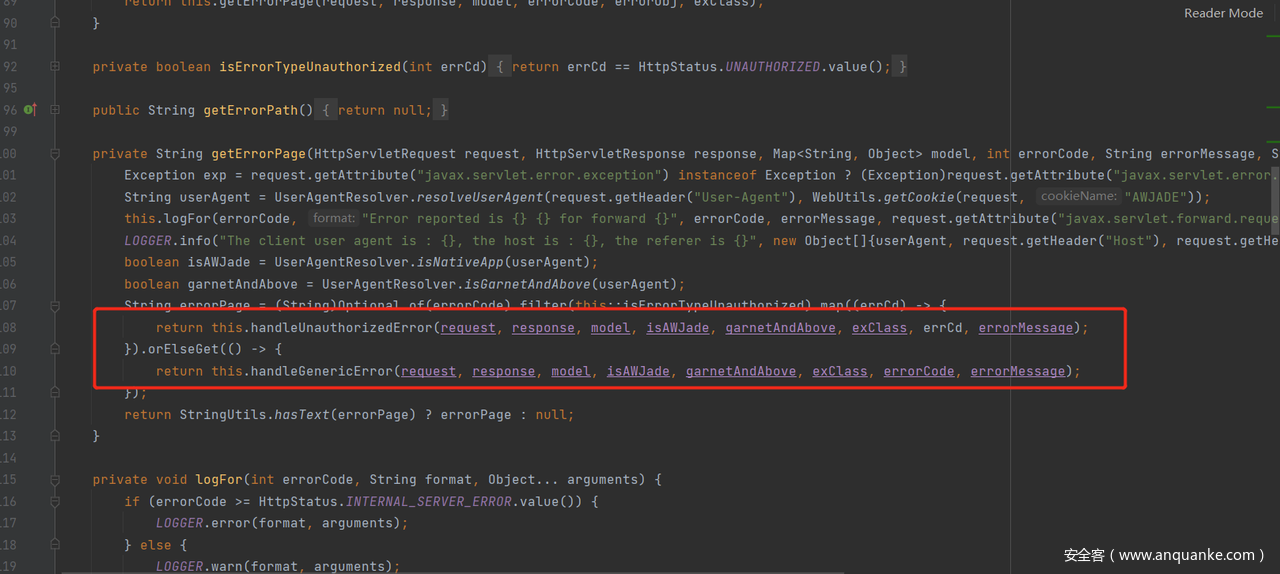 除了直接用handleGenericError函数拿到需要渲染的模板,还存在handleUnauthorizedError函数通过条件判断,只有一个分支进入handleGenericError