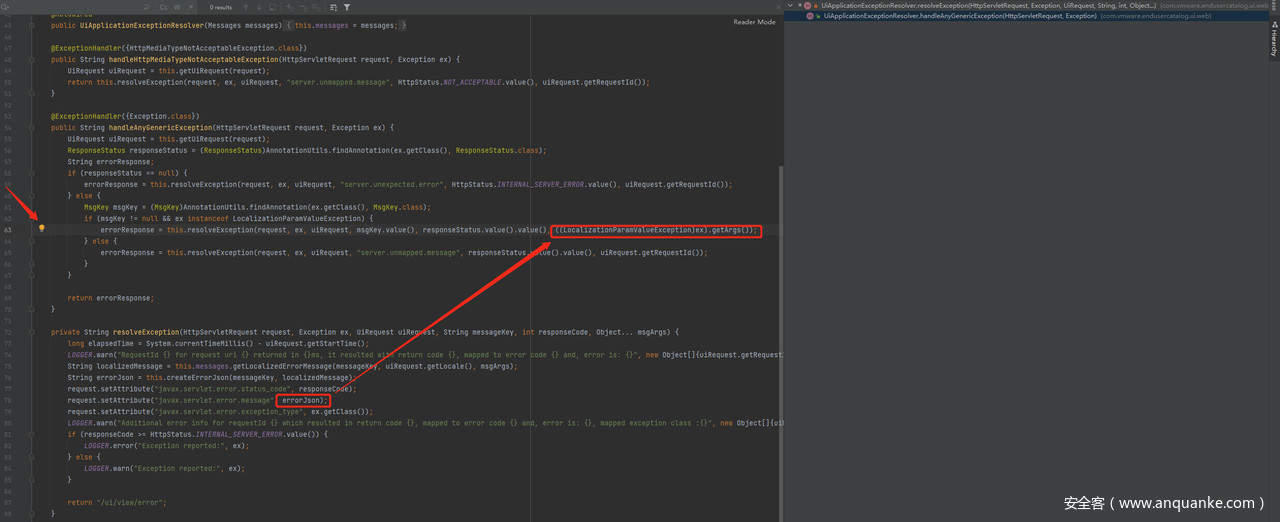 而在 handleAnyGenericException 中,进入 resolveException 时会根据异常的类型传入不同的参数,如果异常类不是 LocalizationParamValueException 子类的话则传入 uiRequest.getRequestId(),所以我们需要构造参数可控的地方还需要抛出 LocalizationParamValueException 异常类或其子类异常,这样errorObj所需Attribute errorJson来自LocalizationParamValueException异常的getArgs。