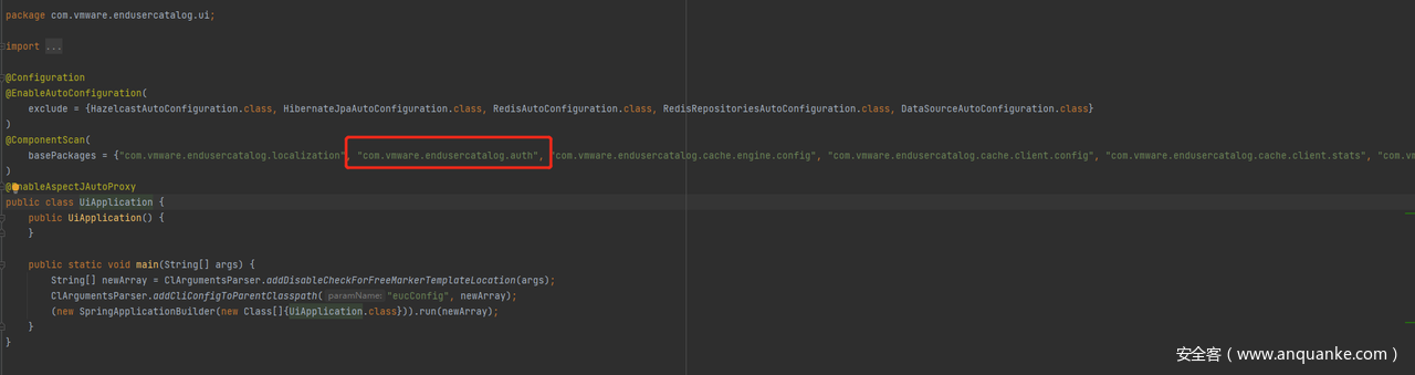 但在com.vmware.endusercatalog.ui.UiApplication,使用 @ComponentScan 注解声明自动将com.vmware.endusercatalog.auth包的类装配进bean容器。