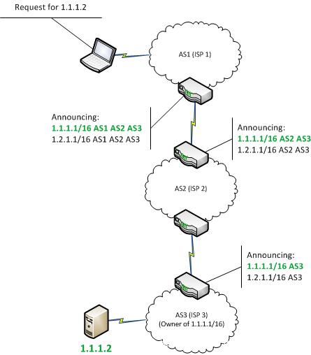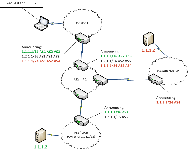 如果恶意通告比合法通告还要具体,或者声称提供更短的路径,那么流量就可能被定向到攻击者那里去。攻击者经常利用弃用的前缀来进行劫持,以免引起合法属主的关注。通过广播含有虚假前缀的通告,受攻击的路由器可能会污染其他路由器的路由信息库。在污染了其他路由器之后,恶意路由信息可能会进一步传播到别的路由器中,或自治系统,甚至主干因特网上。