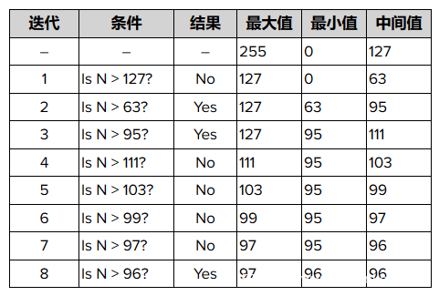 请注意,我们无法直接检索任何数值或字符串值,因此就需要将这些表达式转换成一组布尔查询,并根据其执行时间将其评估为True或False。这就是二进制搜索算法的工作原理,我们不是直接查询数字,而是去查询它是否大于X。在每次迭代中调整X的值,直到我们在log(n)次查询后找到正确的值。举例来说,如果要检索的当前值是97,那么我们对算法执行跟踪,如下所示:
