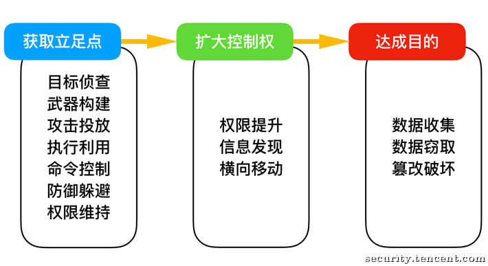下面结合腾讯蓝军十多年的攻防实战演练经验,试对各个阶段的攻击手法与技术简要分析如下: