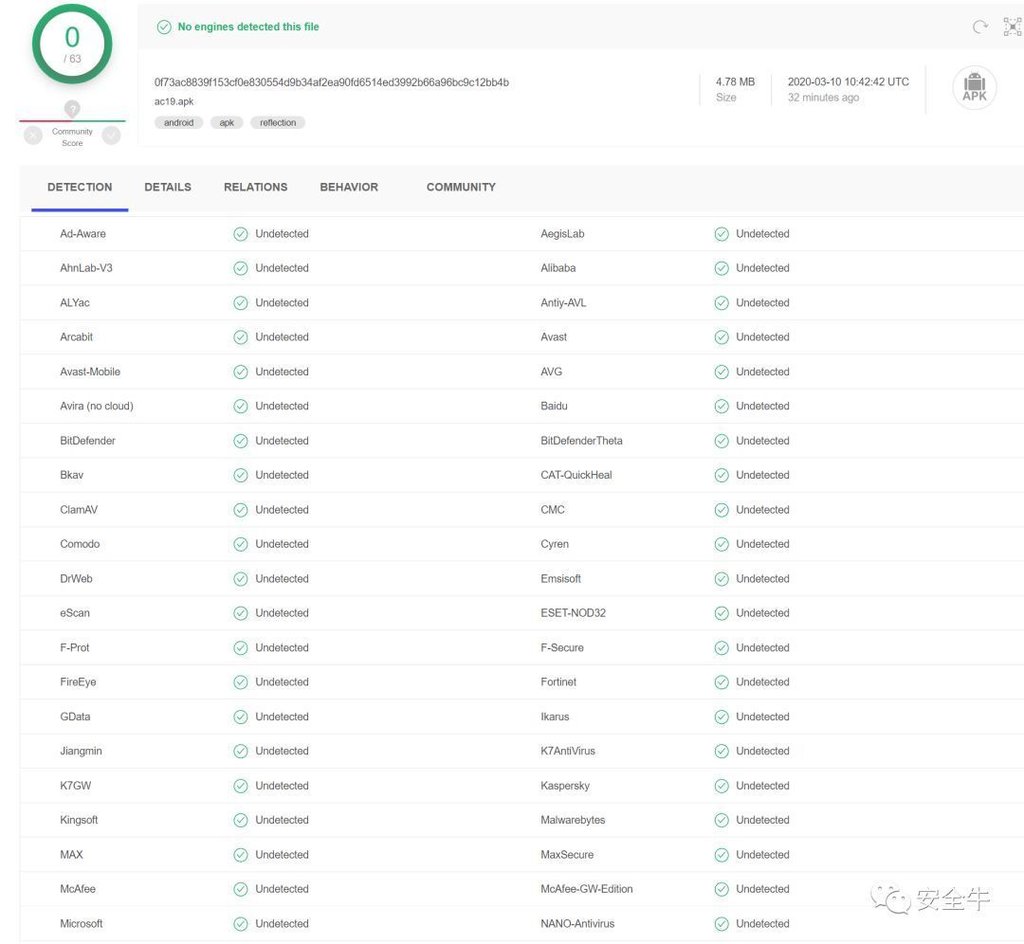 不过,对于一款疫情防控软件,收集电话号码和地理位置数据似乎也并未有“过采”或者不妥之处。安全牛在VirusTotal上查询AC19的IOC未发现任何主流安全软件将AC19标记为恶意软件: