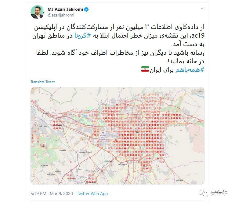 根据伊朗信息和通信技术部长MJ Azari Jahromi今天分享的推文,政府已经借助该应用程序收集了超过400万伊朗人的位置数据点。