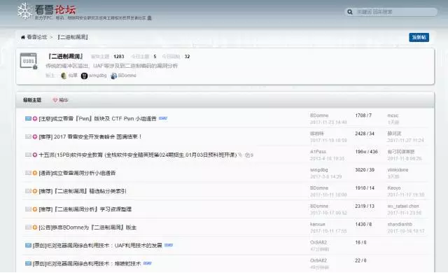 从此,进入了一个黑客的世界,可以和圈子里的朋友一起研究网络安全技术。慢慢地我也认识了启蒙学校“看雪论坛”的各位版主。我最早看到的那个帖子出自看雪“二进制漏洞”版块,版主仙果成为了我的良师益友。这些事如梦幻一般。