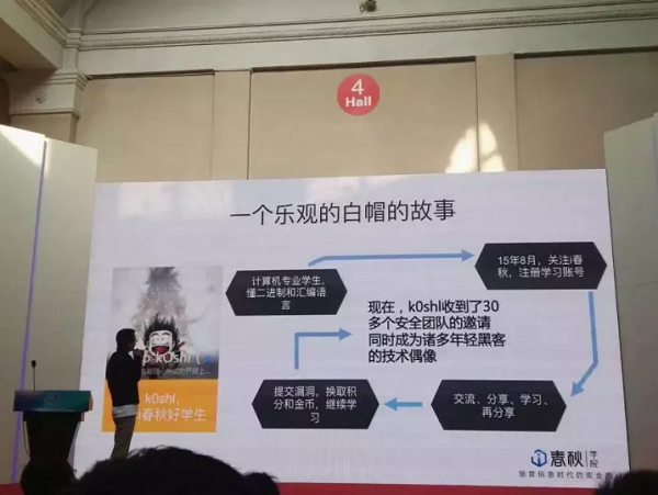 2016年“429”首都网络安全日, i春秋校长蔡晶晶把 K0SH1 的故事讲给现场观众,他称 K0 为“乐观的白帽”。