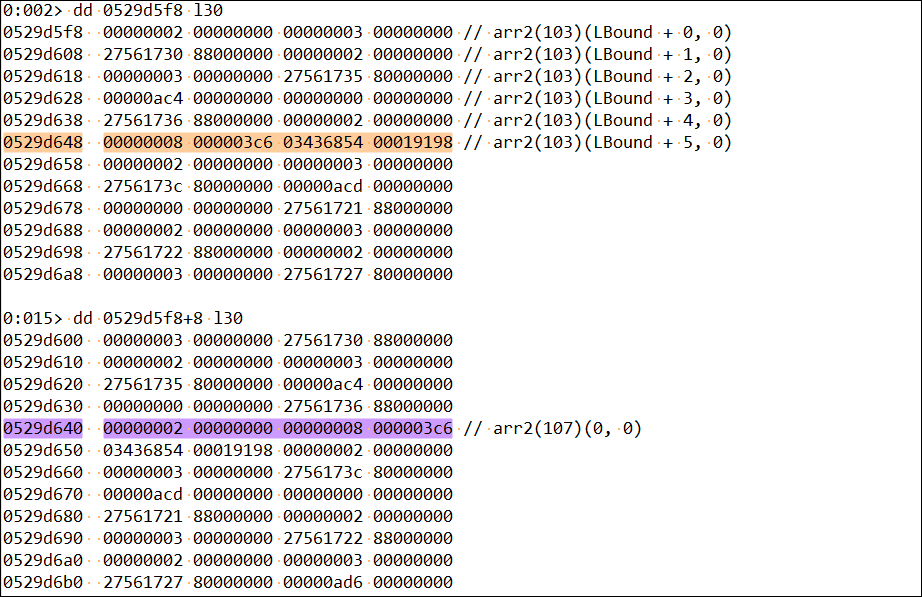 以下是从arr2(103)(LBound, 0)开始的内存视角,可以看到本次调试中找到的g_offset = 5,LBound = 01d89a08。