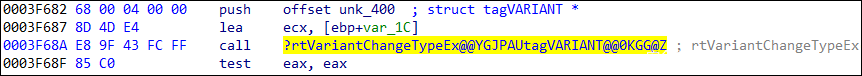 以下汇编代码为vbscript!CScriptRuntime::RunNoEH函数先后调用AccessArray和AssignVar的代码片段,此处AccessArray返回的元素地址会保存到一个栈变量[ebp-1Ch]上,RunNoEH随后会从栈上获取该变量,赋值给edx,并在调用AssignVar时作为目的地址使用。
