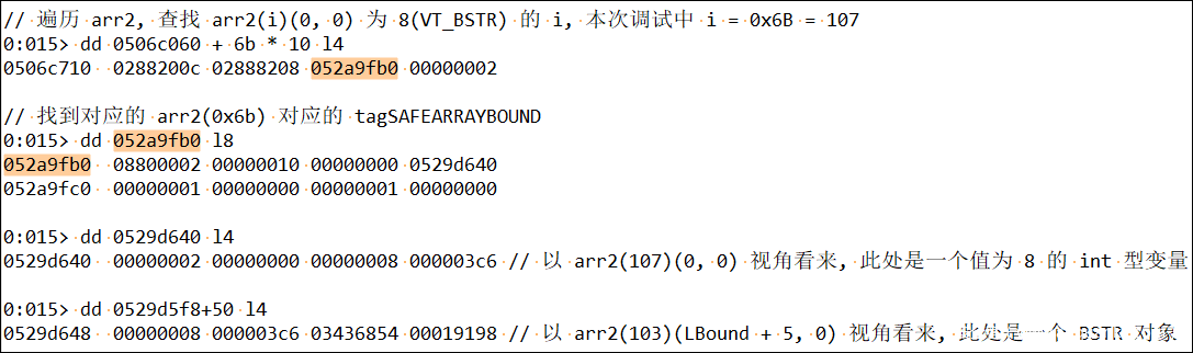 随后代码又以arr2(i)(0, 0)的视角来查找被写入的BSTR变量。本次调试中符合条件的i = 107,所以 mem_index = 107。