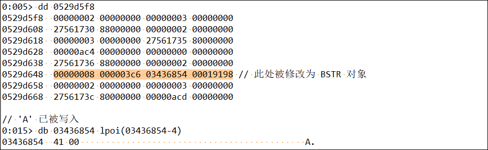 随后一个BSTR变量A被写入0529d648对应的0x10字节