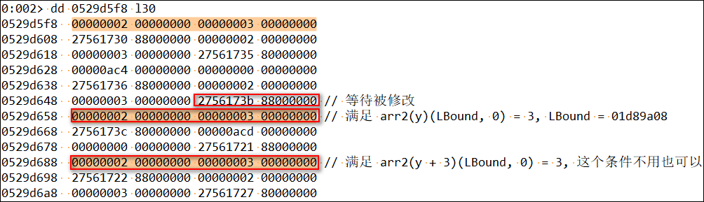 通过上述步骤,&h55555555对应的tagVARIANT被写入某个属于arr2(i)的tagSAFEARRAY结构体。从而获得一个可以用来越界读写的二维数组。