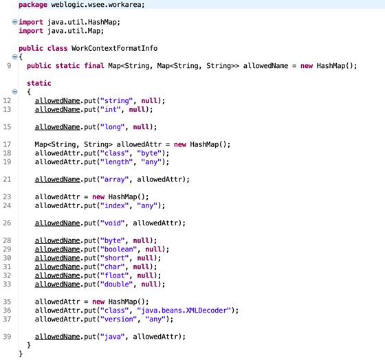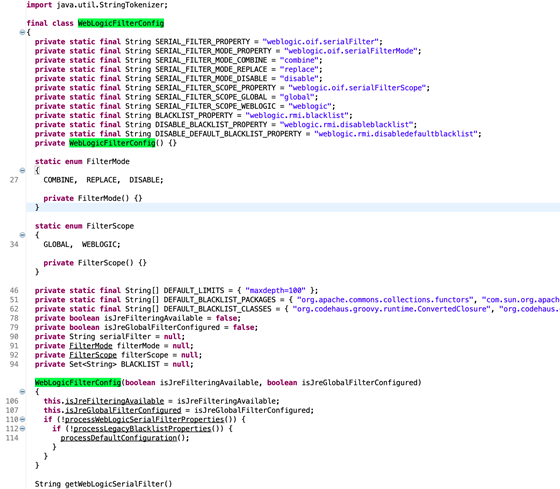WebLogic T3反序列化漏洞用黑名单的方式修复,补丁位置在Weblogic.utils.io.oif.WebLogicFilterConfig.class: