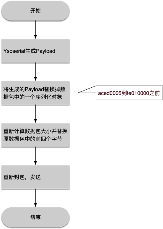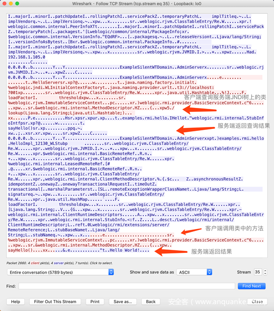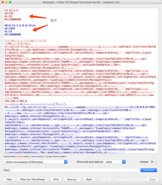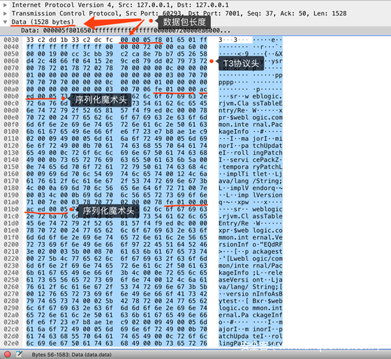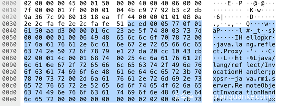 很好,和上面抓到的包一样,握手成功。继续下一步。 下一步我需要替换掉握手后的第一个数据包中的一组序列化数据,这个数据包原本是客户端请求WebLogic RMI发的T3协议数据包。假设我们替换第一组序列化数据: