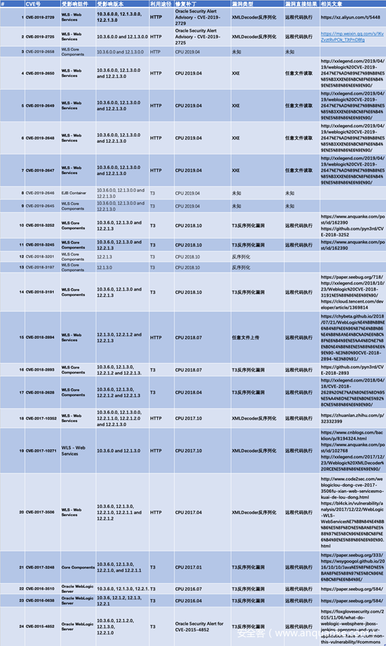 下表列出了一些WebLogic已经爆出的漏洞情况: