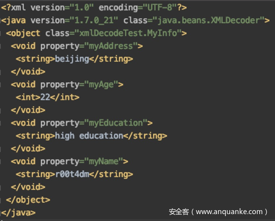 XML(Extensible Markup Language)是一种标记语言,在开发过程中,开发人员可以使用XML来进行数据的传输或充当配置文件。那么Java为了将对象持久化从而方便传输,就使得Philip Mine在JDK1.4中开发了一个用作持久化的工具,XMLDecoder与XMLEncoder。 由于近期关于WebLogic XMLDecoder反序列化漏洞频发,本文此部分旨在JDK1.7的环境下帮助大家深入了解XMLDecoder原理,如有错误,欢迎指正。