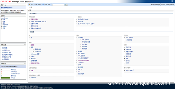安装完成后,打开浏览器访问http://localhost:7001/console/,输入安装时设置的账号密码,即可看到WebLogic Server管理控制台: