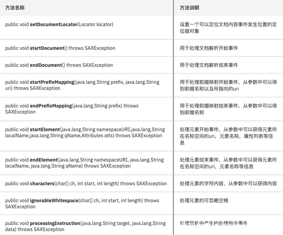 首先实现ContentHandler,ContentHandler是负责处理XML文档内容的事件处理器。