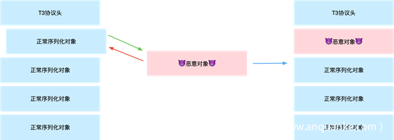 当服务端允许接收远端数据进行反序列化时,客户端可以提供任意一个服务端存在的目标类的对象 (包括依赖包中的类的对象) 的序列化二进制串,由服务端反序列化成相应对象。如果该对象是由攻击者『精心构造』的恶意对象,而它自定义的readObject()中存在着一些『不安全』的逻辑,那么在对它反序列化时就有可能出现安全问题。