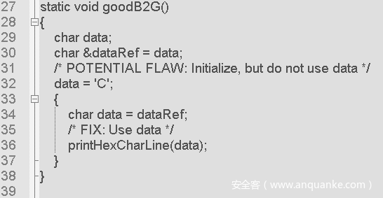 在上述示例代码中,第33行声明了一个局部变量 data,但是直到38行函数结束从未被使用,因此存在“未使用的局部变量”问题。