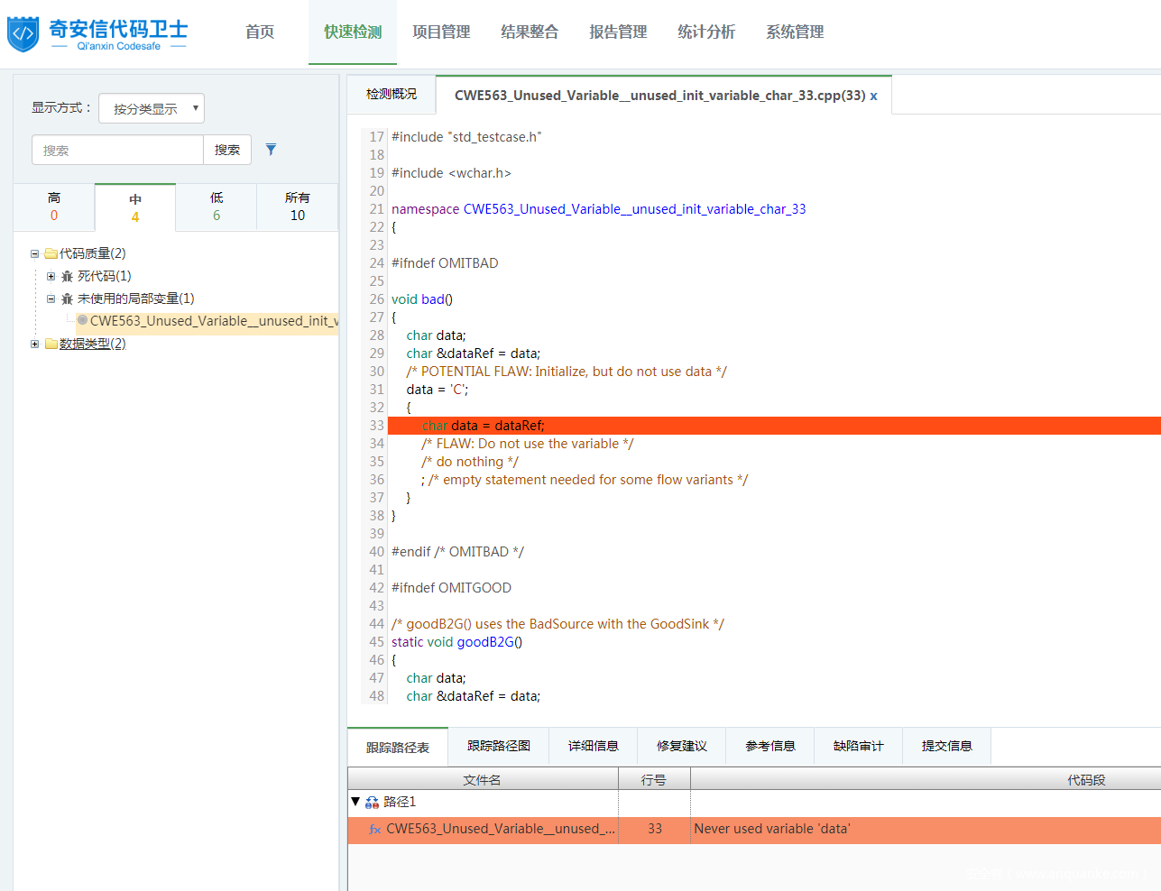 使用代码卫士对上述示例代码进行检测,可以检出“未使用的局部变量”缺陷,显示等级为中。如图1所示: