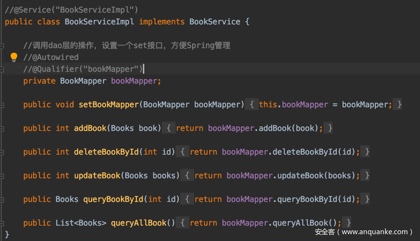 好了,看完了接口我们来看接口的实现类也就是BookServiceImpl。
