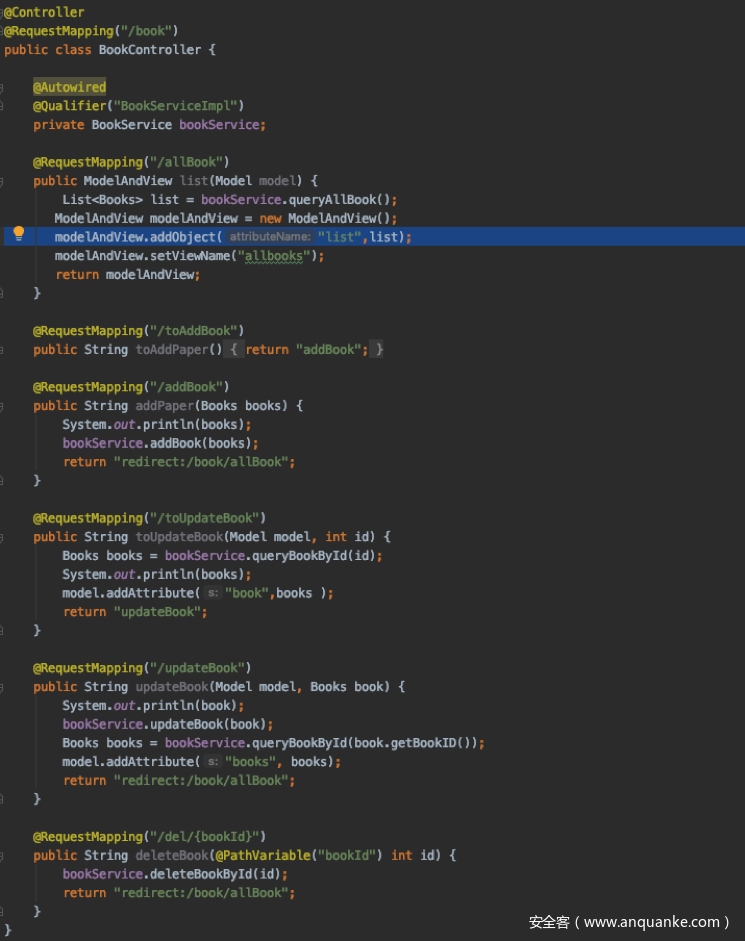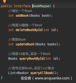 由于实现了BookService这个接口,自然也就需要实现该接口下的所有方法,我们找到queryAllBook方法,发现queryAllBook调用了bookMapper参数的queryAllBook方法,而bookMapper是BookMapper类型的参数。