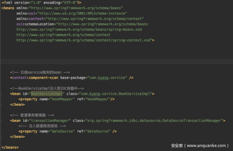 这里我们看到了一个很重要的东西 id为BookServiceImpl的bean,我们可以看到这个bean的class路径是com.kuang.service.BookServiceImpl,