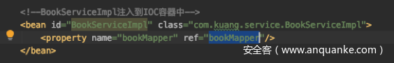 这里我们可以看到我们通过ref属性向BookServiceImpl这个类中的bookMapper参数注入了一个value,这个value是一个其他的bean类型,这个bean的id叫做bookMapper。此时由于我们Service层的BookServiceImpl的queryAllBook方法的实现方式其实就是调用了id为bookMapper的bean的queryAllBook方法。所以这个id为bookMapper的bean就是程序执行的下一步。