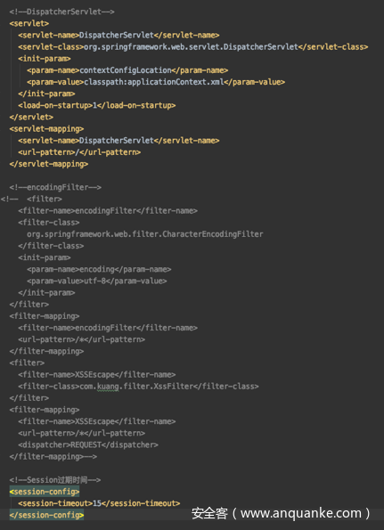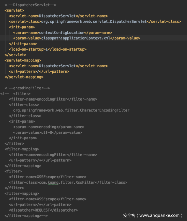 我们在审计这类漏洞时,最简单的方法就是先去web.xml中去查看有没有配置相关的过滤器,如果有哪我们就去看看过滤器的规则是否严格,如果没有那就很有可能存在漏洞。