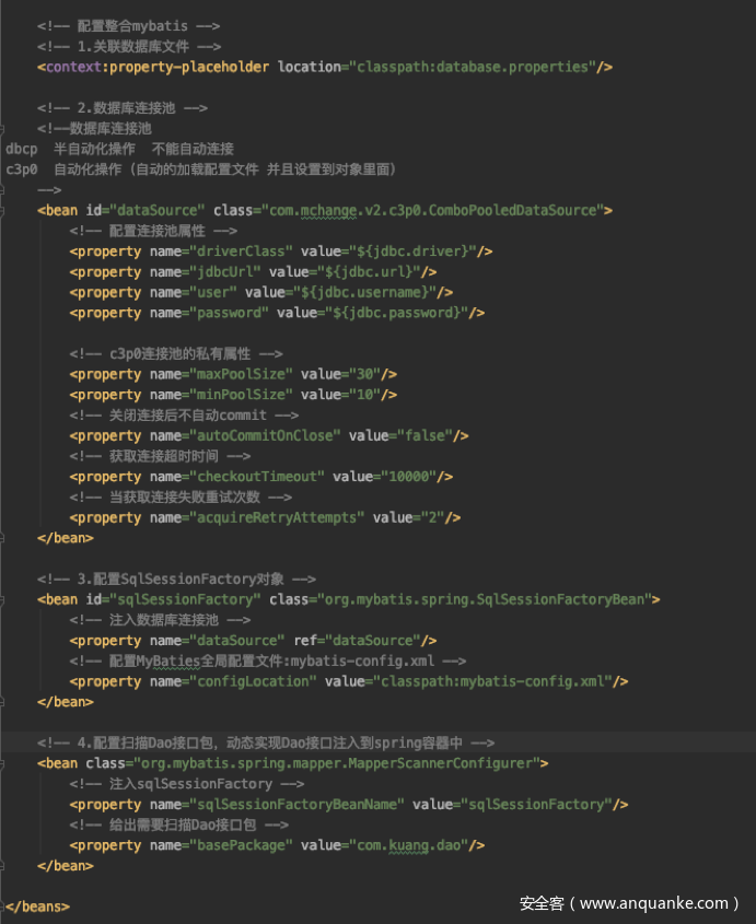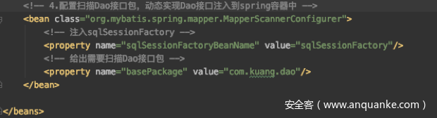 这个配置通过生成MapperScannerConfigurer的bean来实现自动扫描com.kuang.dao下面的接口包,然后动态注入到Spring