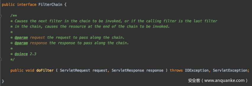 最后一个参数FilterChain,通过名字我们猜这个参数是一个过滤链,查看一下FilterChain的源码