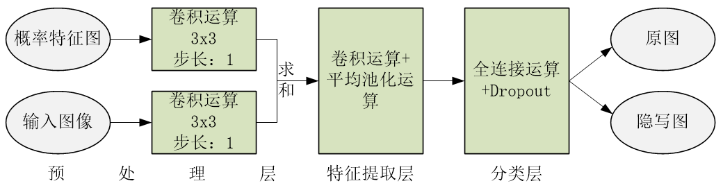 隐写可被视为向原图像中加入轻微幅度的噪声信息,人眼几乎不能识别隐写图像和原图像之间的差异。噪声信息改变了相邻像素之间的依赖性,因此,依据像素间的依赖性可以有效地检测图像中是否存在隐写噪声信息。现有空域富模型中的高通滤波器可通过计算图像中的残差信息来捕获捕获隐写术的噪声痕迹,因此,在预处理层中应用高通滤波器提取出可表征隐写信息的残差特征图。同时应用选择通道的知识,有效地计算出不同像素被嵌入隐写信息的概率,获取到对应的概率特征图。最终将这两种特征图做求和运算获取到可信的隐写信息。
