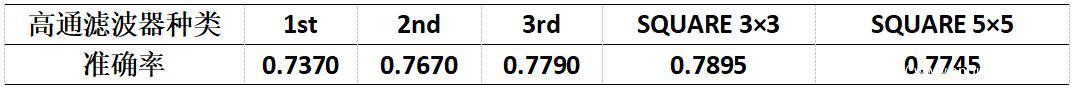 以自适应隐写算法WOW、嵌入率0.4为例,应用五种不同的高通滤波器初始化预处理层的卷积核后,隐写分析算法的检测准确率如下表所示。