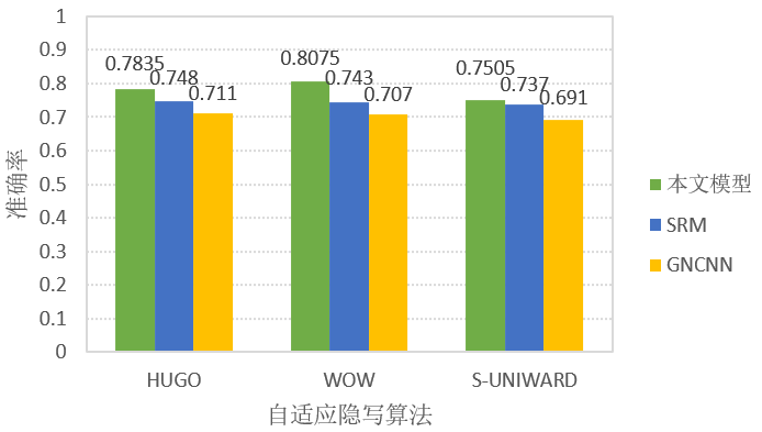 将本文的隐写分析模型与传统的空域富模型SRM、基于深度学习的隐写分析模型GNCNN作比较,三种隐写算法的嵌入率均为0.4,隐写检测准确率如下图所示。