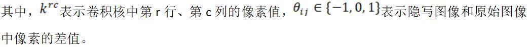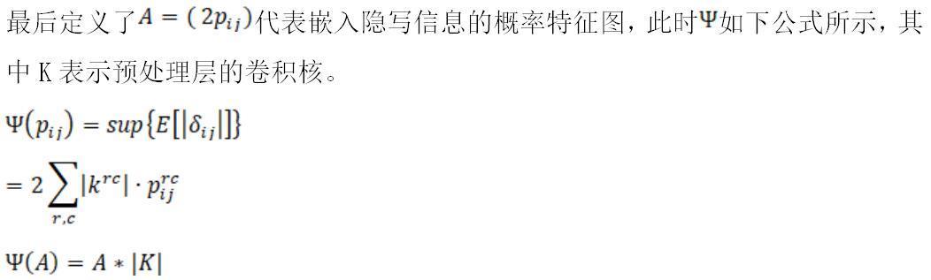 根据已有研究知识,已知概率特征和残差特征图的汇合方式主要有两种。第一种方式是使用残差特征图乘以经过一定缩放后的概率特征图,第二种方式将残差特征图与概率特征图直接相加。第二个方式更有利于网络的汇聚,其提取出的残差特征可表征更丰富的隐写特征,因此应用第二种方式作为概率图的汇合方式,如下公式所示,其中,R表示残差特征图,R后面的那个符号表示概率特征图。