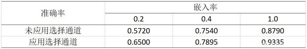 为了更好地查看选择通道的性能,本文在自适应隐写算法WOW的三个嵌入率0.2、0.4和1.0下查看应用选择通道和未应用选择通道的隐写分析算法准确率,结果如下表所示。
