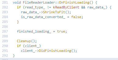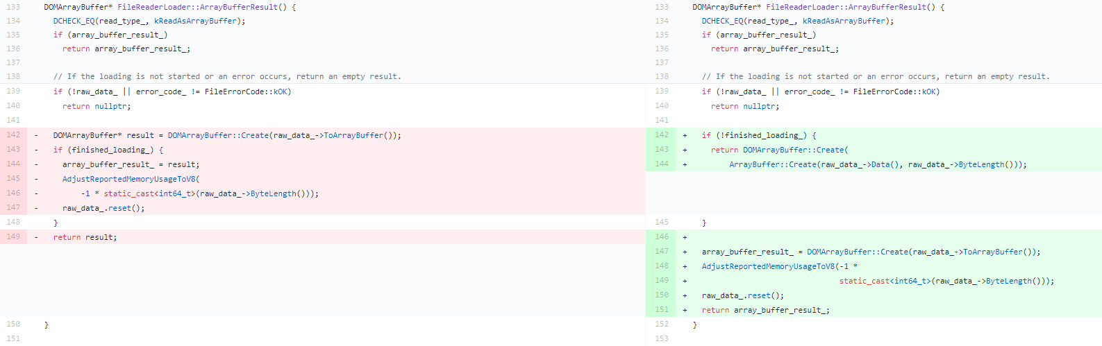 对比补丁可以看到DOMArrayBuffer* result = DOMArrayBuffer::Create(raw_data_->ToArrayBuffer()),操作放到了判断finishedloading后面,返回值也从result变成了array_buffer_result(result的拷贝)。猜测可能是这个返回值导致的问题。