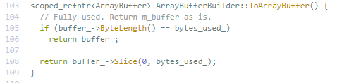 raw_data_->ToArrayBuffer()可能会返回内部buffer的拷贝,或者是返回一个指向其偏移buffer的指针。
