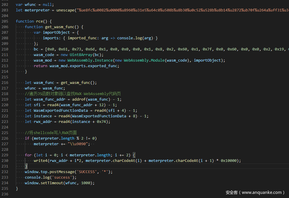 使用任意读取/写入原语遍历WebAssembly模块中导出的函数的JSFunction对象层次结构,以找到可读写可执行区域的地址。将WebAssembly函数的代码替换为shellcode,然后通过调用该函数来执行它。